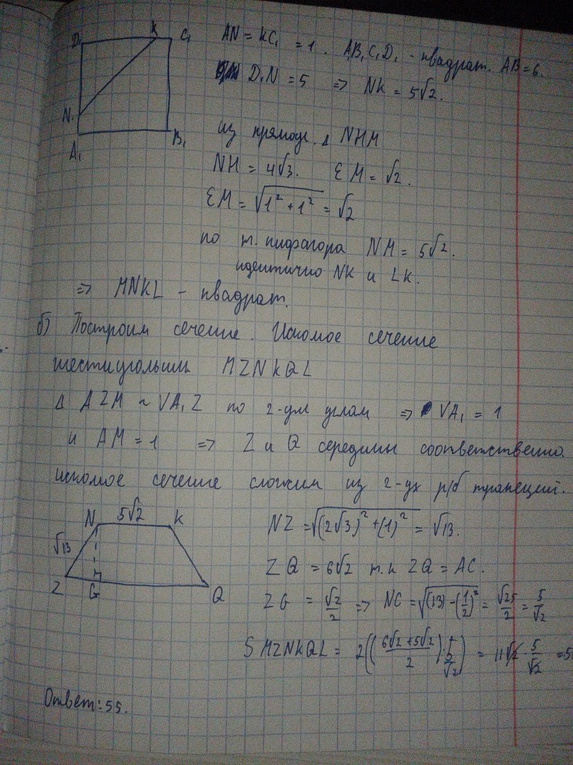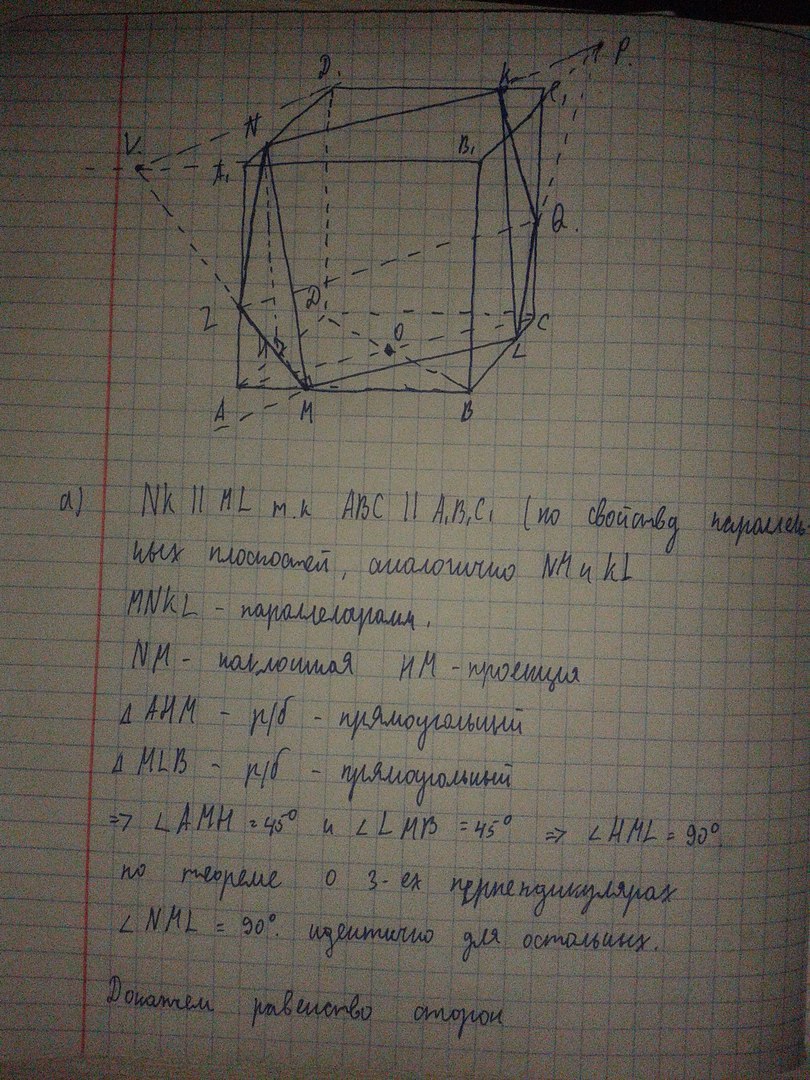 а) Пусть L - точка пересечения плоскости MNK с ребром BC. Докажите, что MNKL - квадрат.