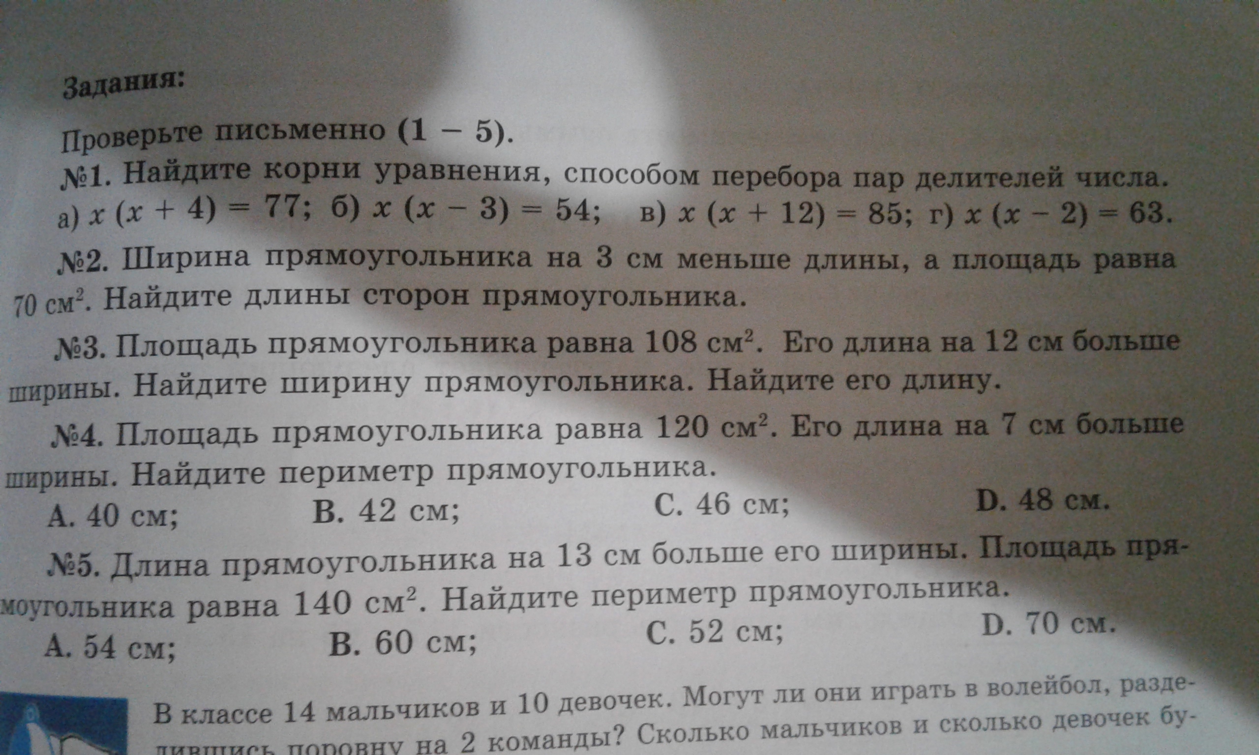 пусть ширина - х см, длина - х+13 см, тогда площадь равна х*(х+13), по условию задачи площадь равна 140 см^2,