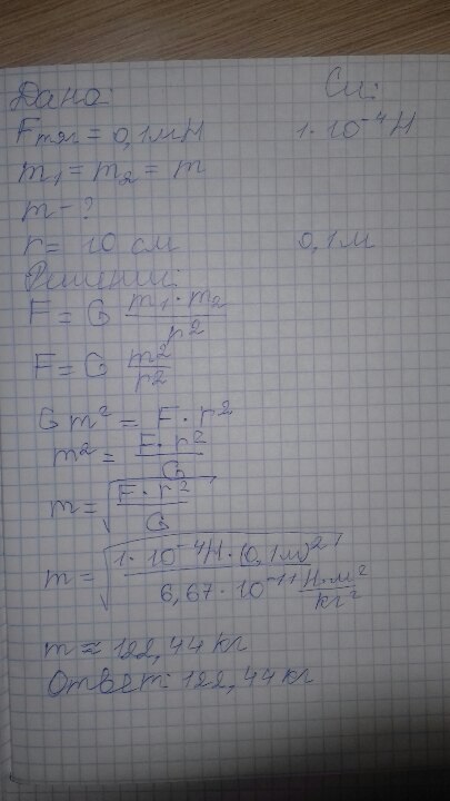 сила тяготения между двумя одинаковыми шарами 0,1 мН.Определите массу шаров,если расстояние между их центрами 10см