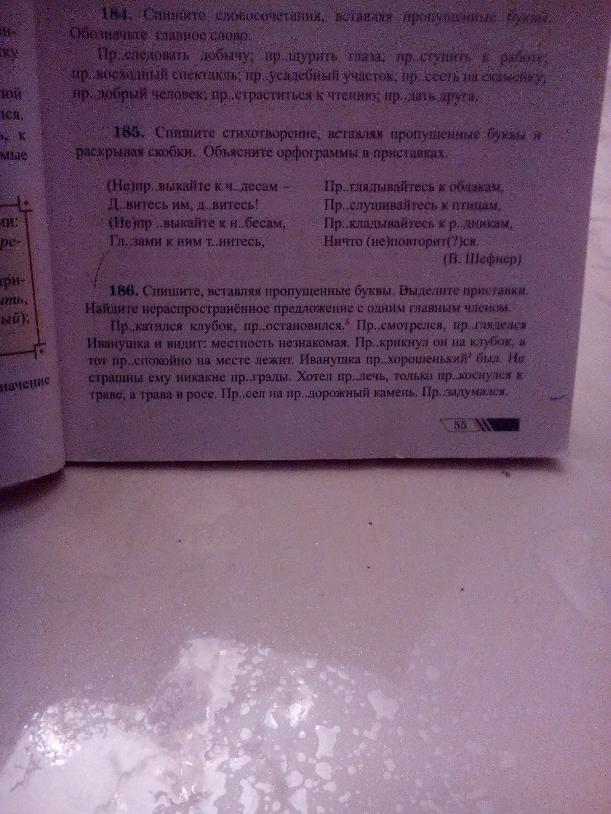 При-катился клубок, при-остановился. При-смотрелся, пригляделся Иванушка и видит: местность незнакомая. При-крикнул он на клубок, а то преспокойно на месте лежит. Иванушка пре-хорошенький был. Не страшны ему никакие преграды. Хотел при-лечь, только при-коснулся к траве, а трава в росе. При-сел на при-дорожный камень.