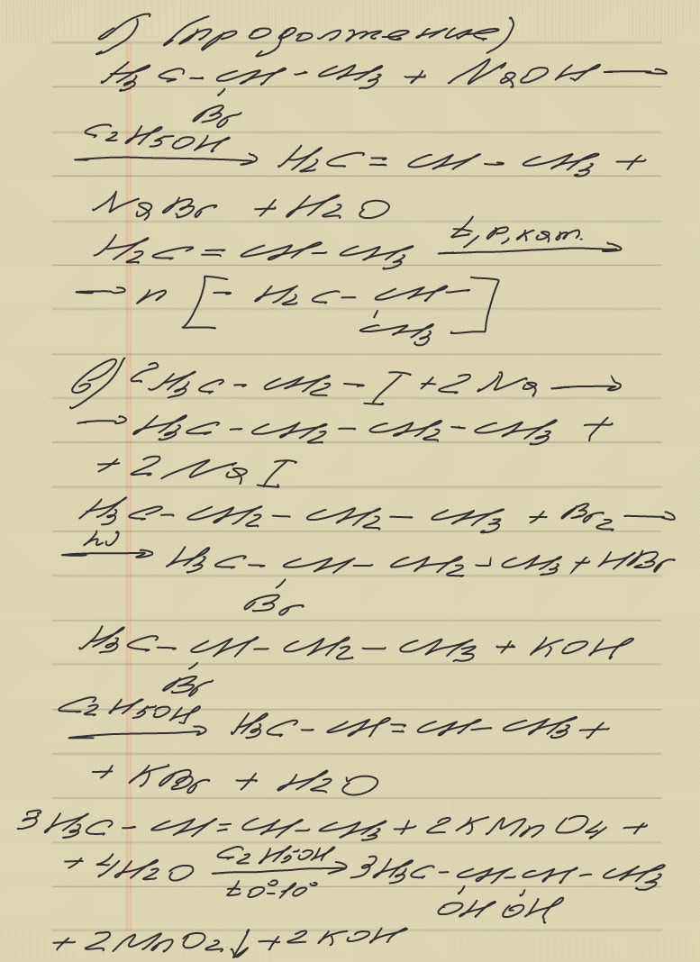 в)этилиотид(иодэтан)---- бутан---- 2-бромбутан---- бутен-2 ----бутандиол-2,3