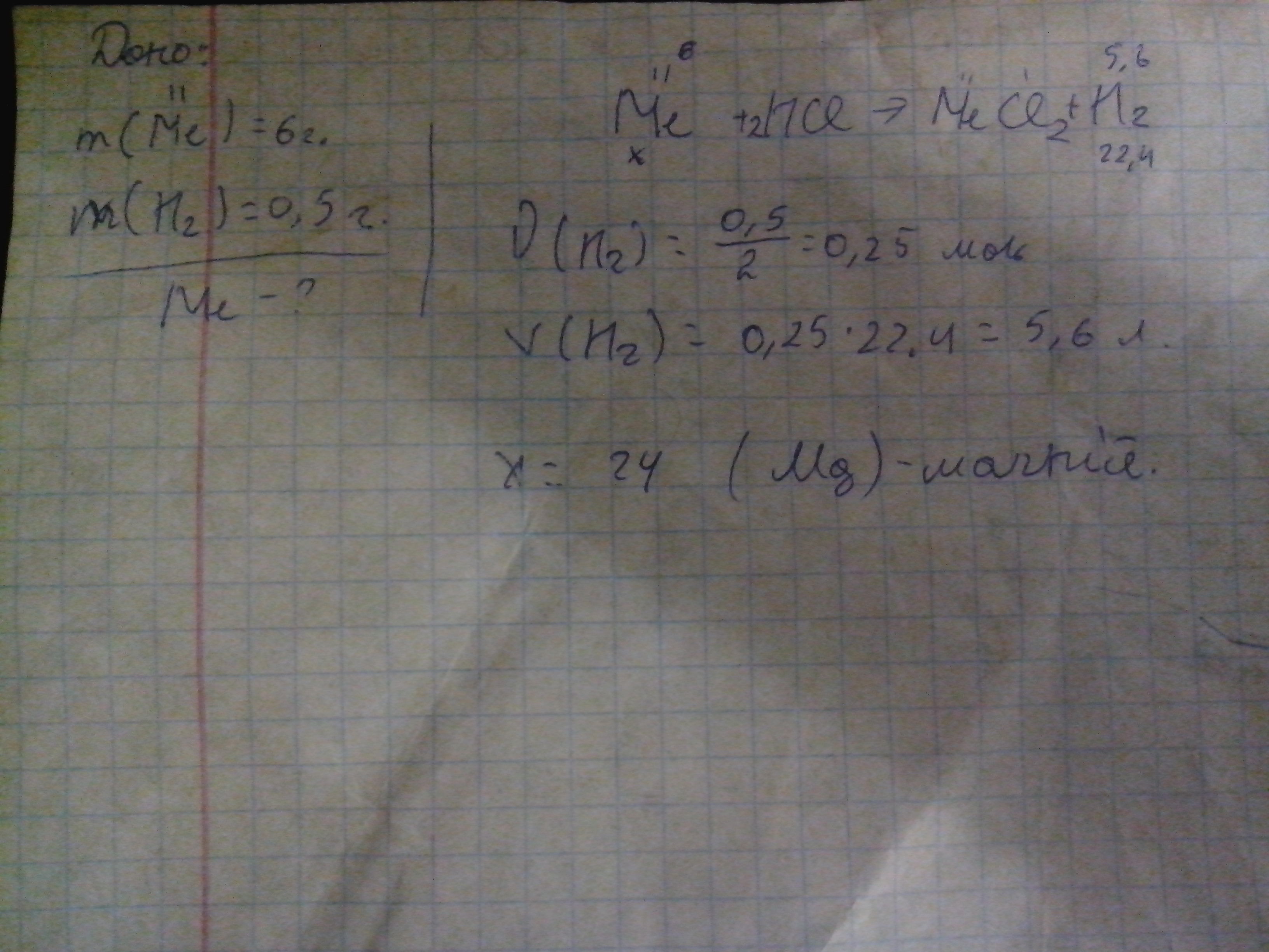 внаслідок взаємодії двохвалентного металу масою 6 г з хлоридною кислотою виділився водень 0, 5 г обчисліть і назвіть який це метал