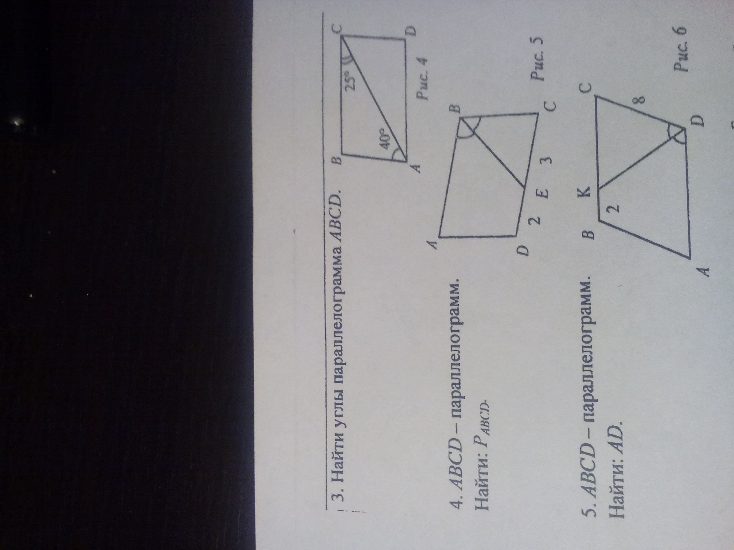 сумма углов треугольника =180 градусов, значит угол В=180-(25+40)=115;угол В=Д=115; сума углов четырехугольника 360градусов, значит 360-(115+115)=130; Угол С=А=65