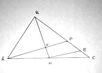 Проведем из точки M отрезок MЕ, параллельный AP, до пересечения со стороной ВС. Тогда по теореме Фалеса для угла АСВ и параллельных MЕ и AP отрезок MЕ будет делить на равные отрезки сторону угла СР, т.е. РЕ=ЕC.