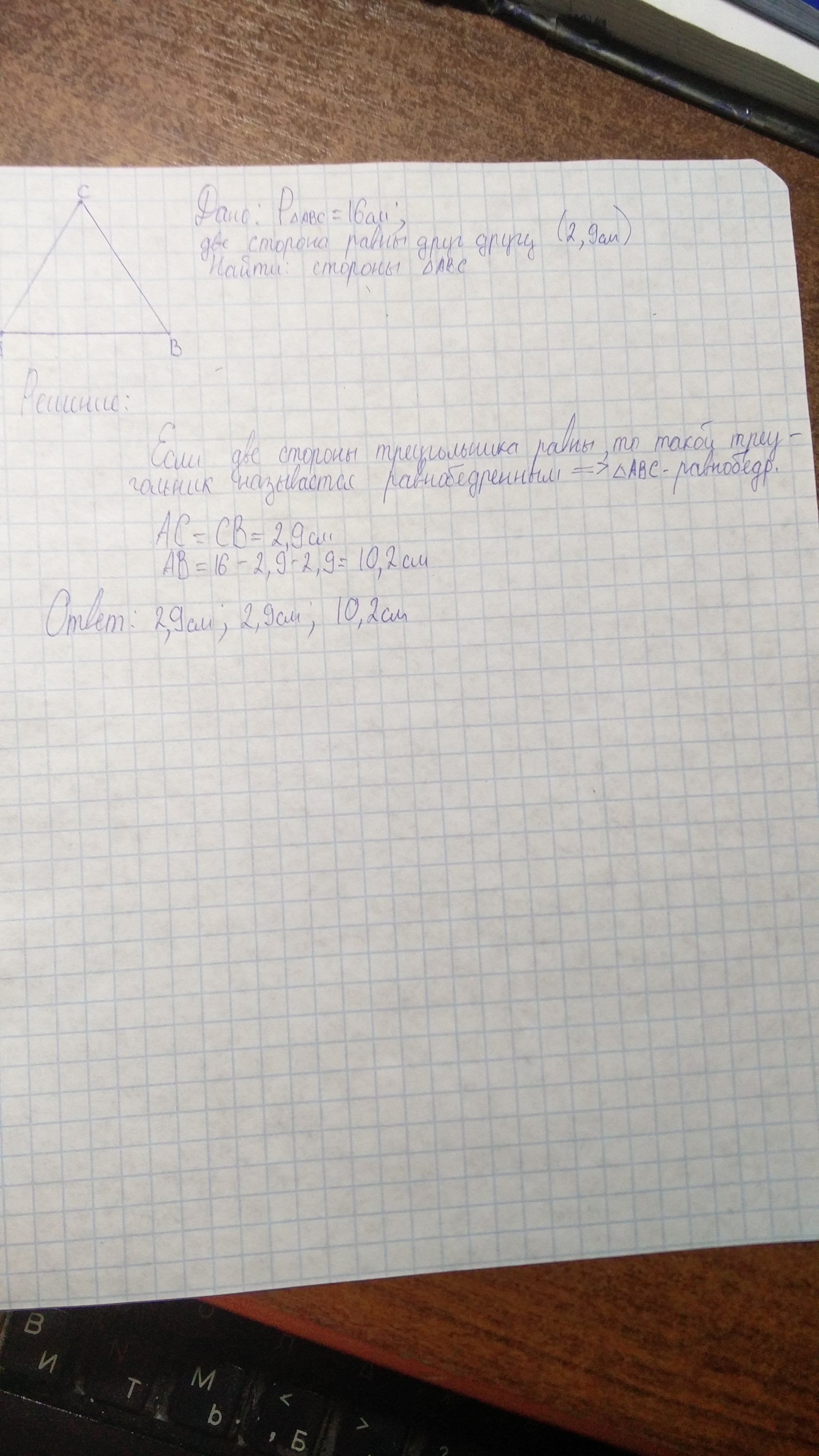 перемитр треугольника равен 16 см две его стороны равны между собой и каждая из них 2.9 см каковы стороны треугольника?
