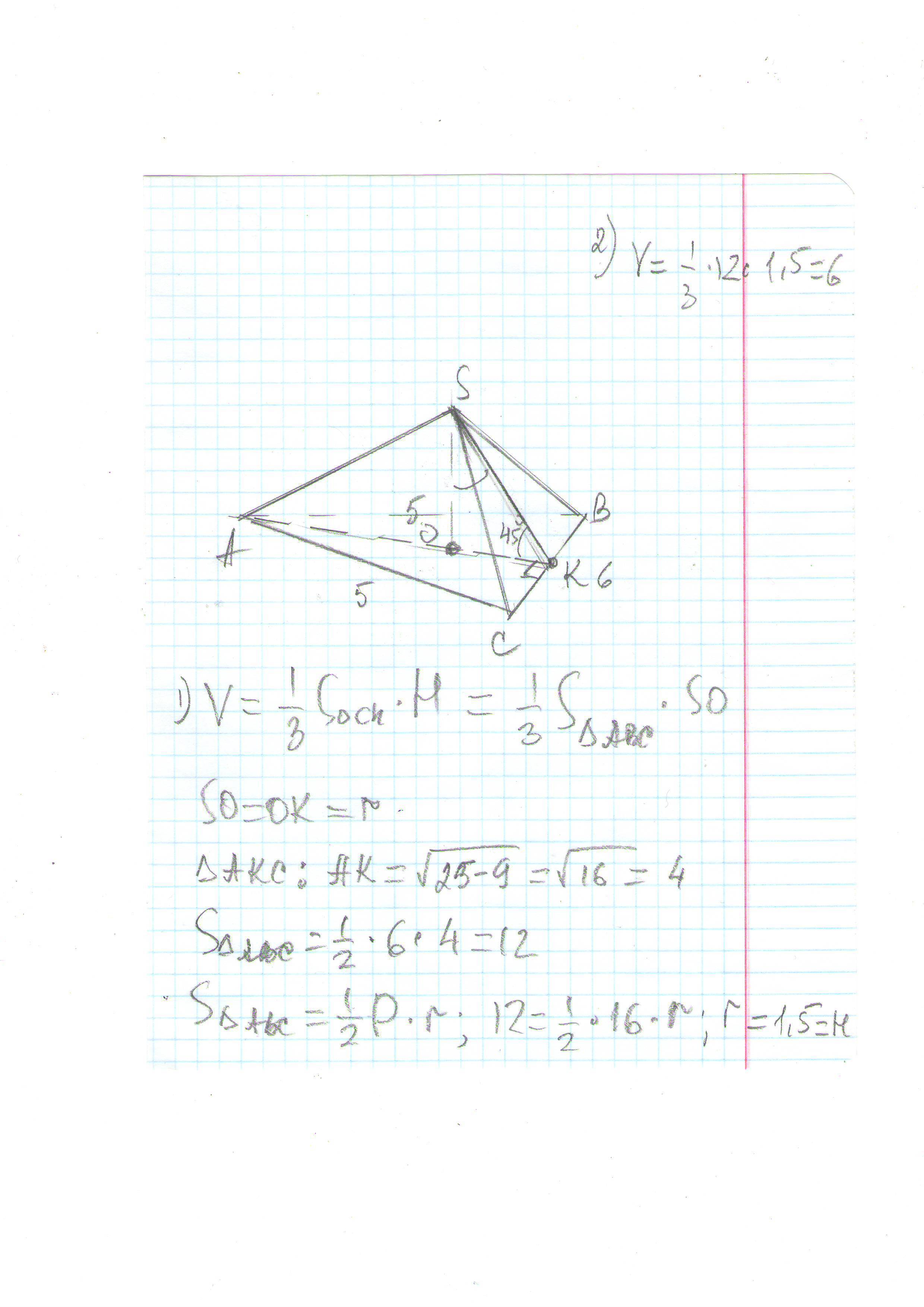 2) Основанием пирамиды служит треугольник со сторонами 5 см, 5 см, 6 см. Каждая боковая грань наклонена к плоскости основания под углом 45° . Найти объем пирамиды.