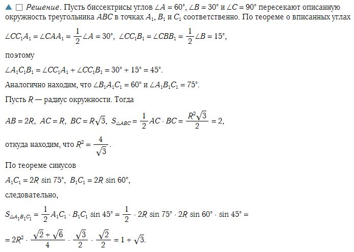 биссектрисы внутренних углов треугольника продолжены до пересечения с описанной около треугольника окружностью . в результате попарного соединения этих точек получился новый треугольник . известно, что углы исходного треугольника равны 30, 60 и 90 градусов, а его площадь равна 2. найдите площадь нового треугольника.
