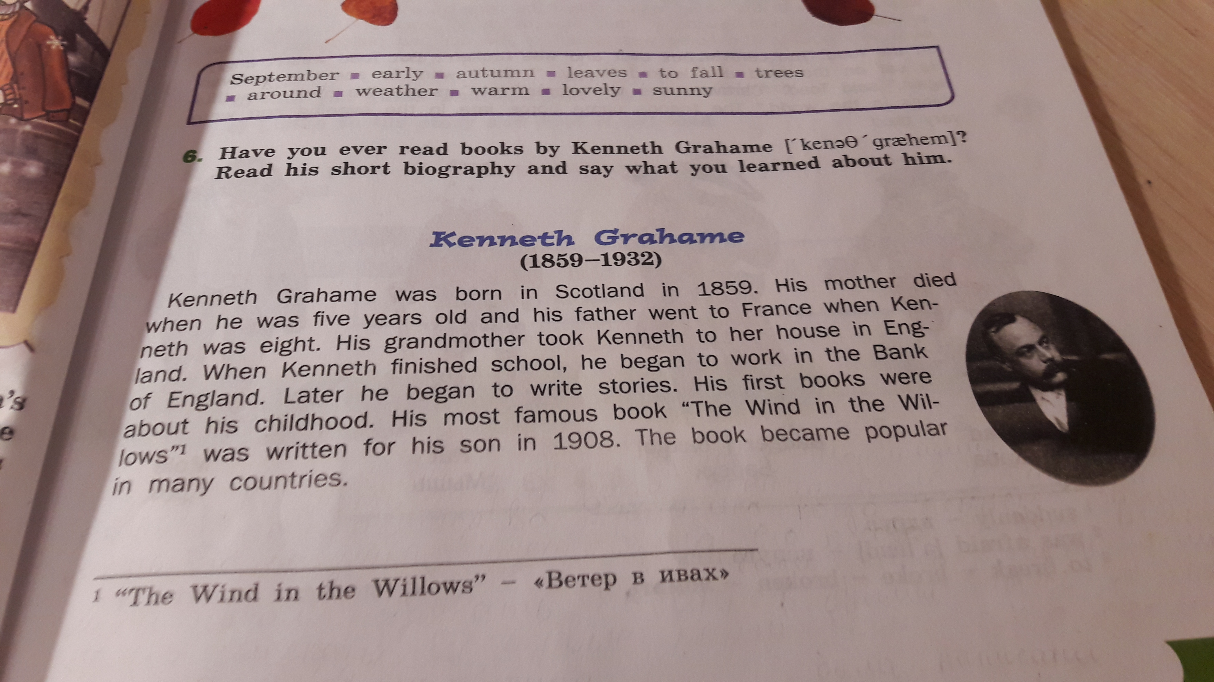 Кеннет Грэм родился в Шотландии в 1859 году. Его мать умерла, когда мальчику было пять лет, и когда Кеннету исполнилось восемь, его отец уехал во Францию. Бабушка Кеннета забрала его к себе в Англию. Когда Кеннет закончил школу, он начал работать в Английском банке. Позже он начал писать рассказы. Его первая книга была о его детстве. Его самая знаменитая книга "Ветер в ивах" была написана в 1908 году для его сына. Книга стала популярной во многих странах.