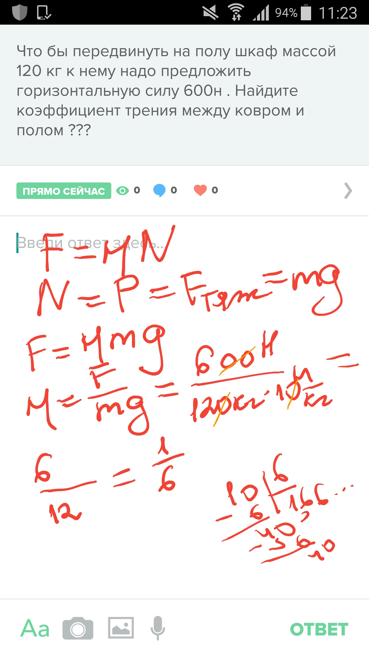 Что бы передвинуть на полу шкаф массой 120 кг к нему надо предложить горизонтальную силу 600н . Найдите коэффициент трения между ковром и полом ???
