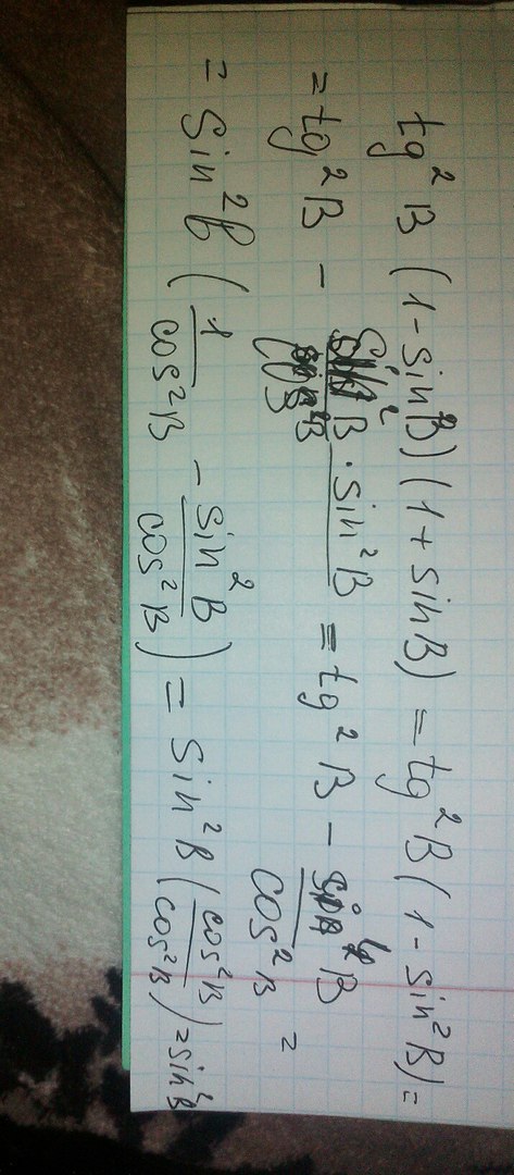tg²(b) *(1-sinB)(1+sinB)=tg²(b) (1-sin²b)= tg² (b) -tg² (b)*sin²(b) =tg²b-sin^4b/cos²b = sin²b(cos²b/cos²b)=sin²b