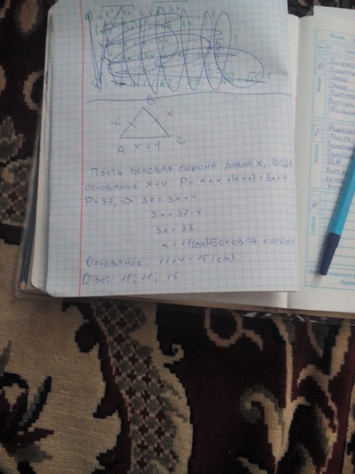 в равнобедренном треугольнике основание больше ребра на 4 см. найдите стороны треугольника если периметр треугольника равен 37 см.