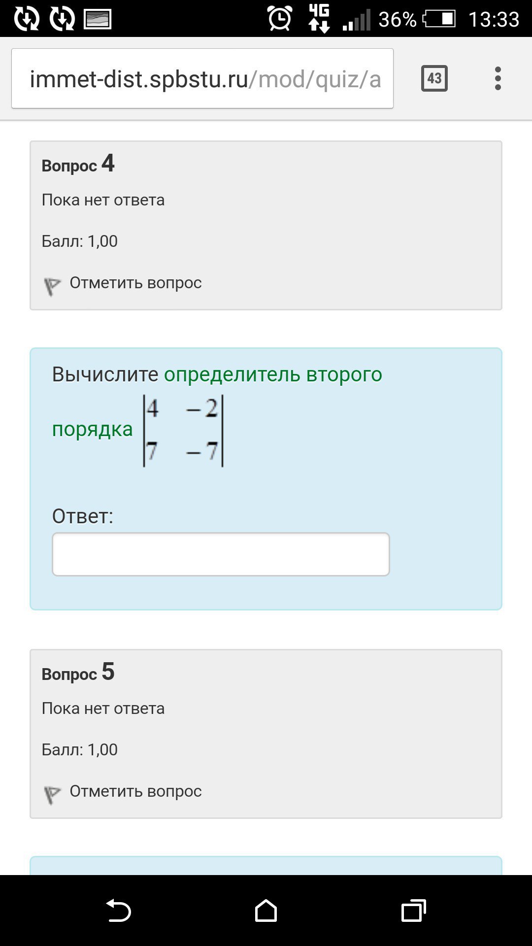 Определитель = 4*(-7)-(-2)*7= -28+14= -14