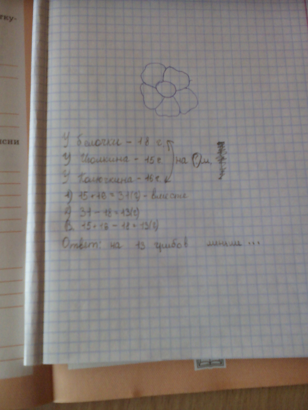 как правильно записать краткую запись и решить с пояснением.Задача:у белочки Стрелочки 18 грибов, у ежа Иголкина 15 гр., а у ежа Колючкина 16. На сколько меньше грибов у Стрелочки ,чем у обоих ежат вместе?