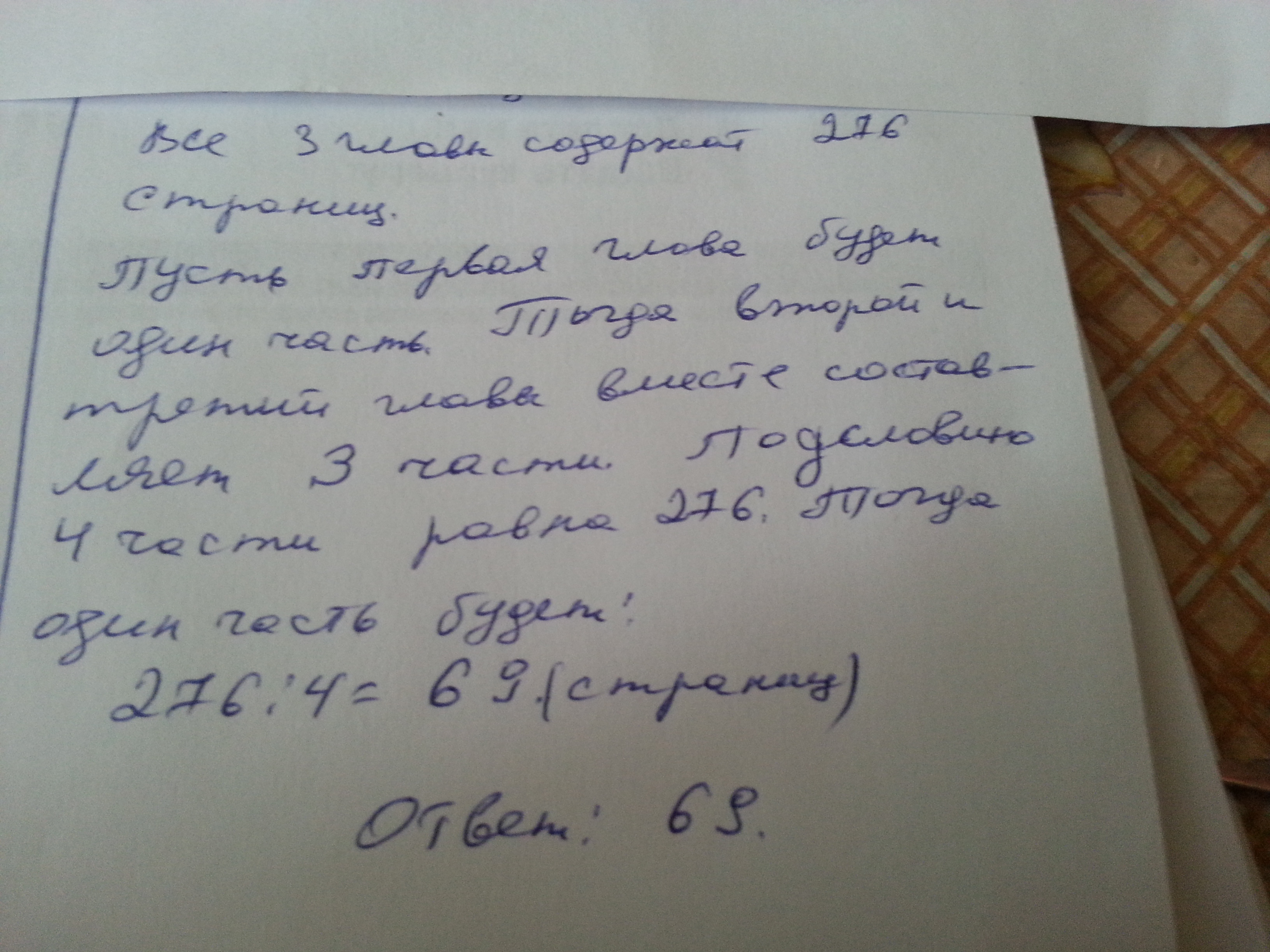 Первая глава книги содержит в 3 раза меньше страниц,чем две другие,вместе взятые.3 главы вместе содержат 276 страниц.Сколько страниц в первой главе? Можно решить пожалуйста по действиям ,а не уравнением?