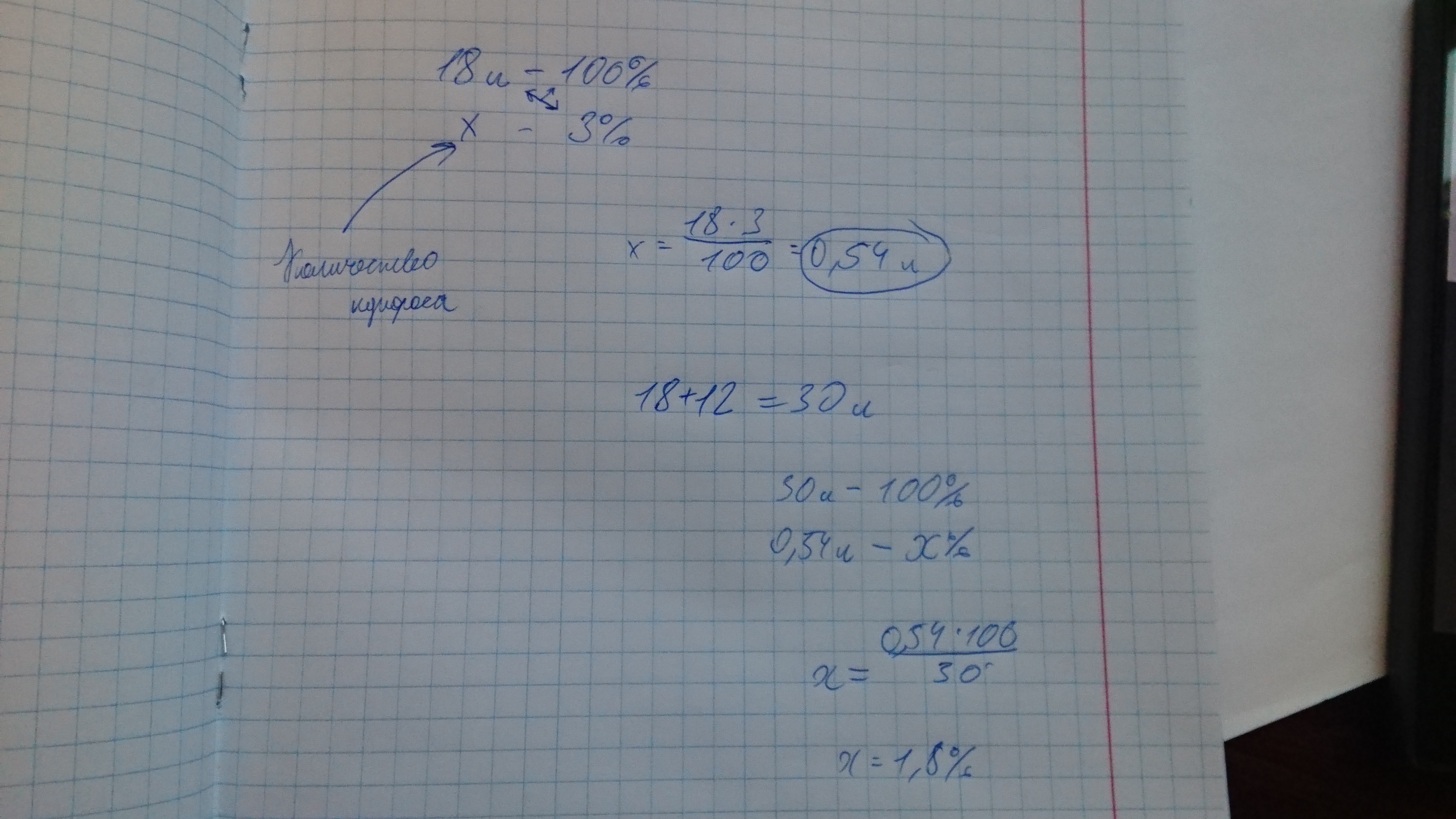 В сосуд содержащий 18 литров 3% водного раствора купороса меди,добавили 12 литров воды.Определите концентрацию получившегося раствора.