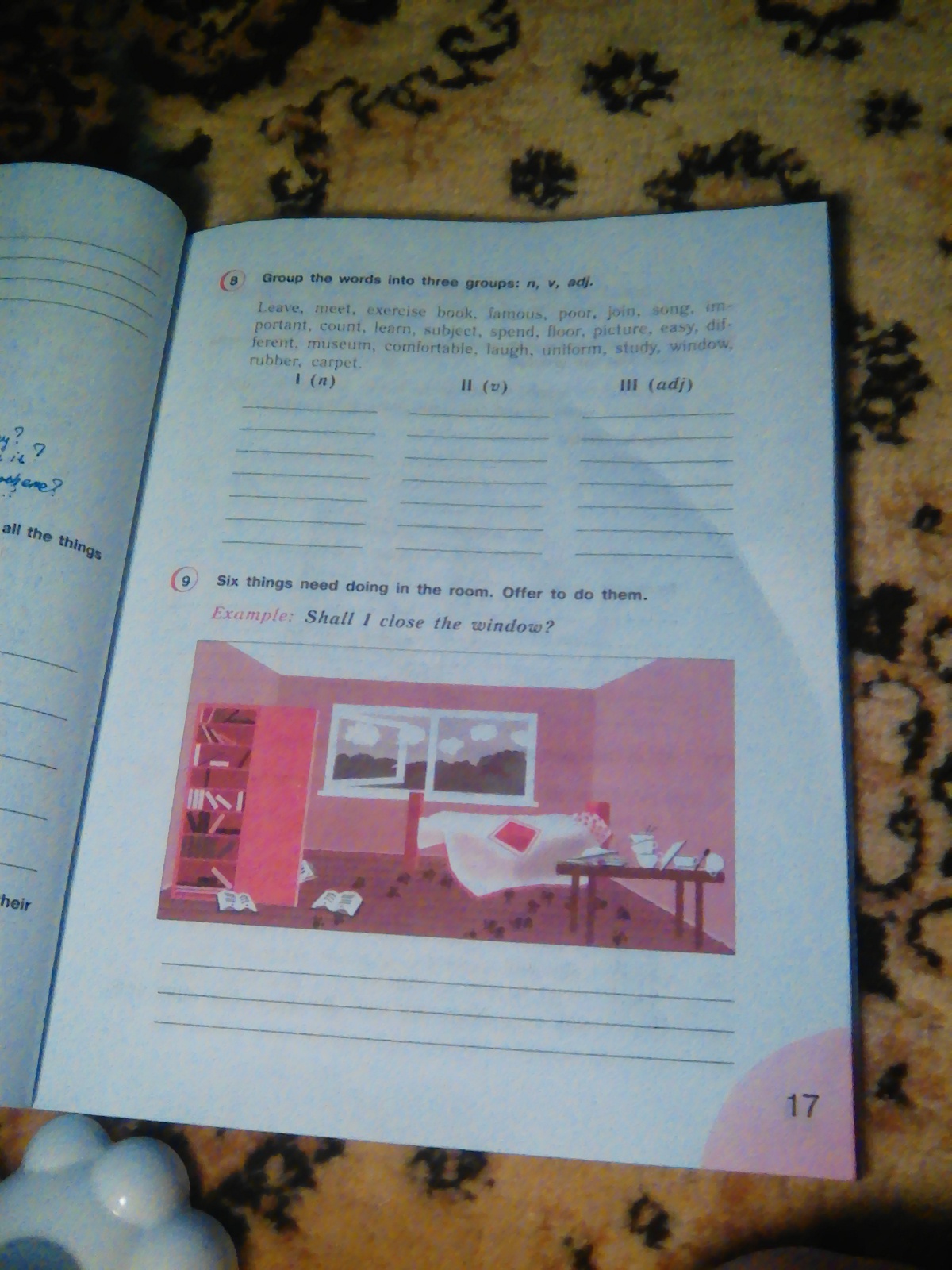 Exercise book, song, count, subject, floor, picture,museum, uniform, window, rubber, carpet