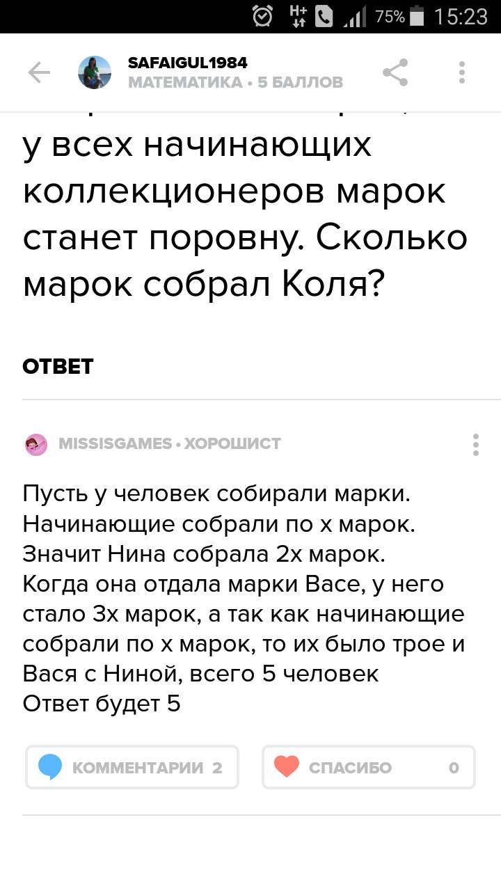 В классе несколько человек начали собирать марки. Если Нина отдаст Коле из своих марок на одну марку меньше половины собранных ею марок, то у всех начинающих коллекционнеров марок станет поровну. Сколько марок собрал Коля???