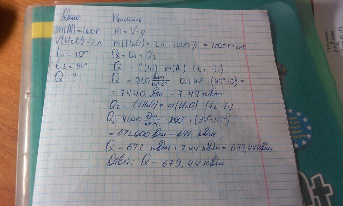Алюминиевая кастрюля массой 100 г с 2 л воды нагрета от 10 c до 90c какое количество теплоты затрачено на это?