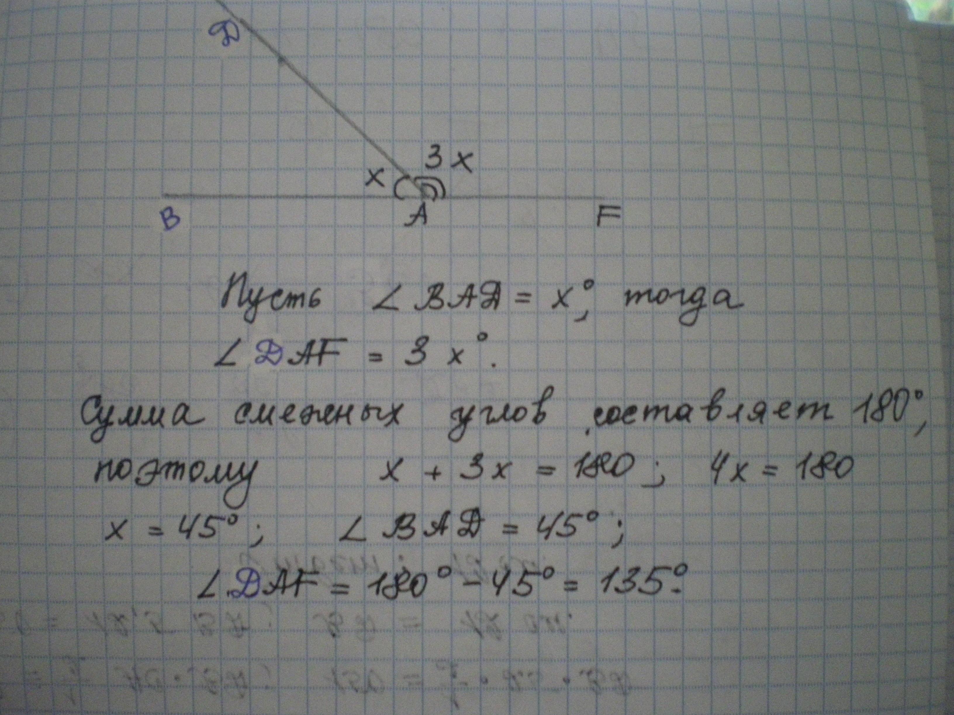 Помогите пожалуйста срочно!!! Углы DAB и DAF — смежные. Угол DAB в три раза меньше угла DAF. Найдите угол DAF. Сделайте рисунок.