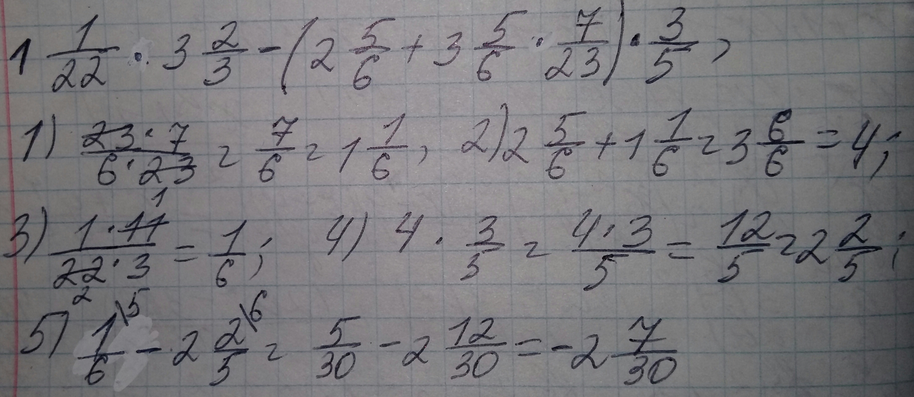 ПОМОГИТЕ РЕШИТЬ ПРИМЕР ПО ДЕЙСТВИЯМ 1целая 1/22×3целых2/3-(2целых5/6+3целых5/6×7/23)×3/5=? ПОМОГИТЕ РЕШИТЬ ПО ДЕЙСТВИЯМ