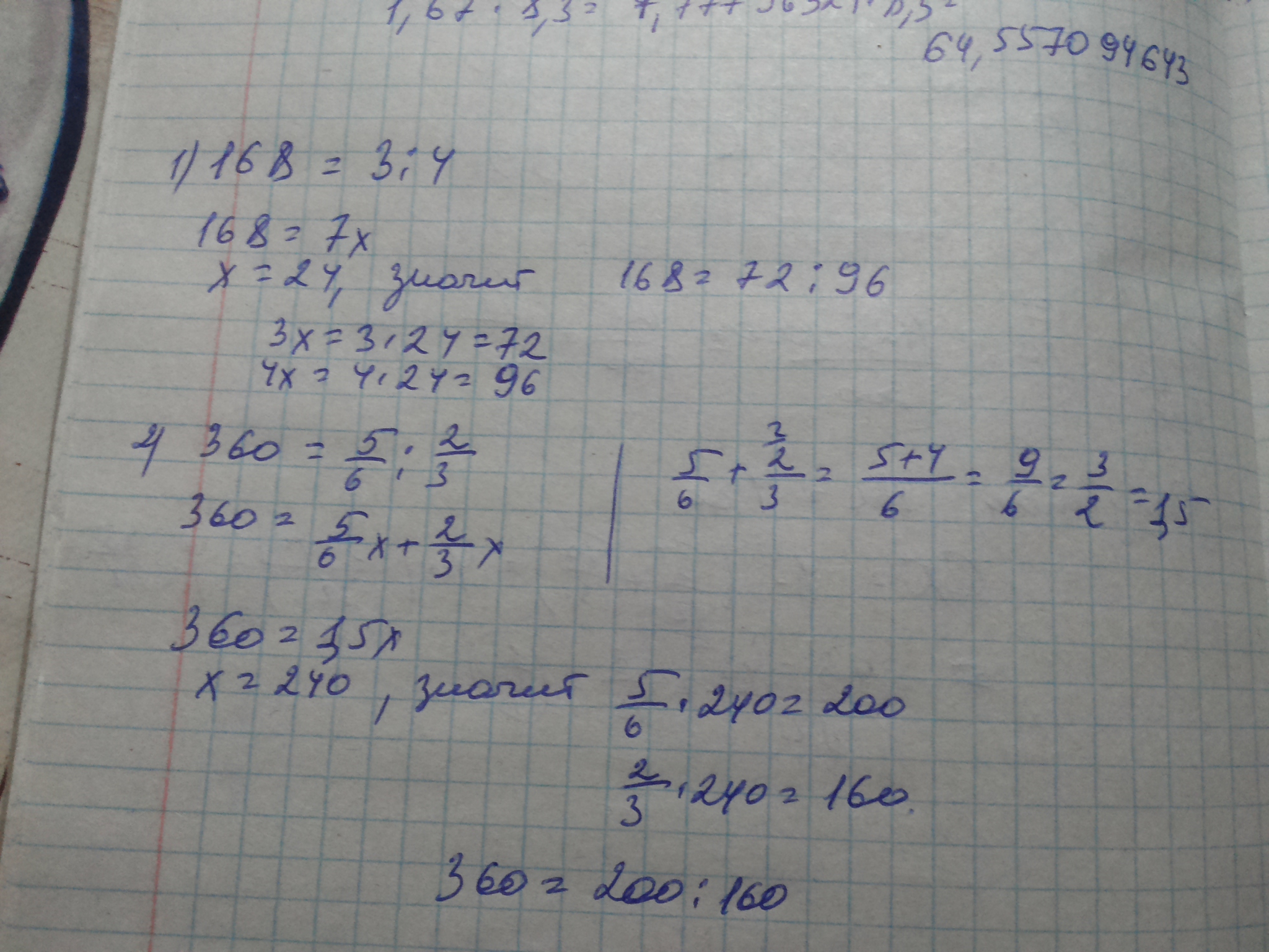 2)360 на части прямо пропорциональные числам 5/6 и 2/3
