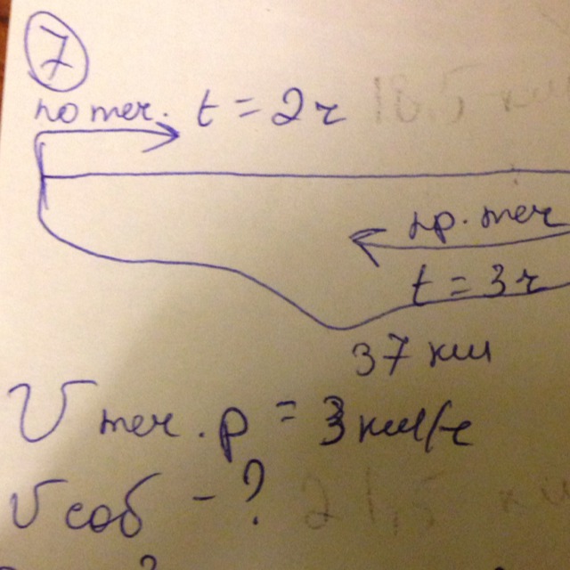 Всего 37 км, время против течения 3 часа, по течению 2 часа, скорость течения реки 3км/час , найдите собственную