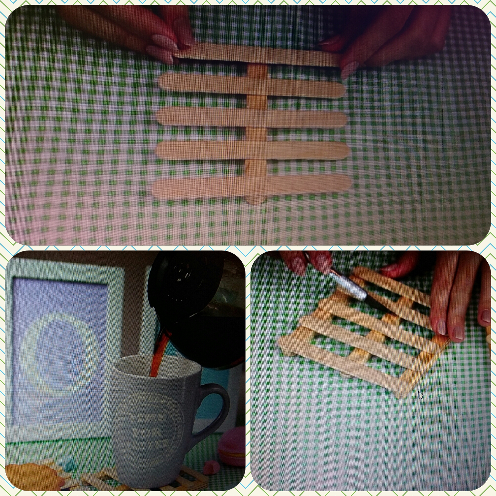 Могу посоветовать крутую идею как сделать подставку под горячее из палочек от мороженого.