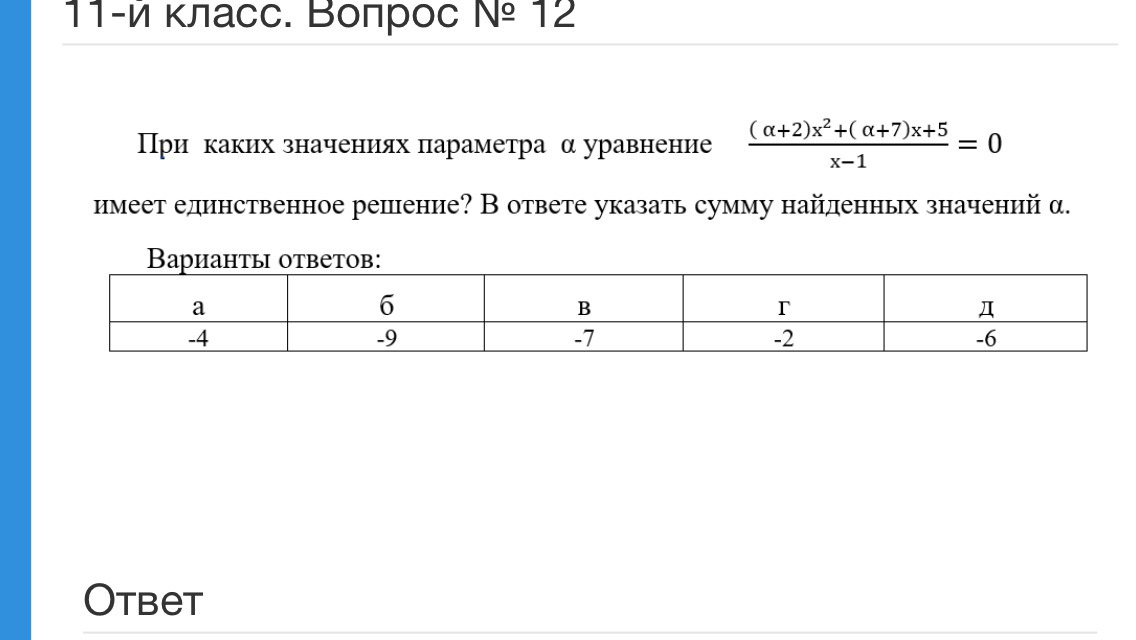 Это квадратное уравнение. Оно имеет один корень тогда, когда дискриминант равен нулю.