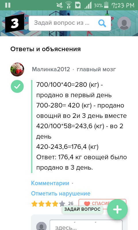 в магазин завезли 700 кг овощей которые были проданы за 3 дня в первый день было продано 40% овощей, во второй 58%остатка. Определите массу овощей, проданных в третий день