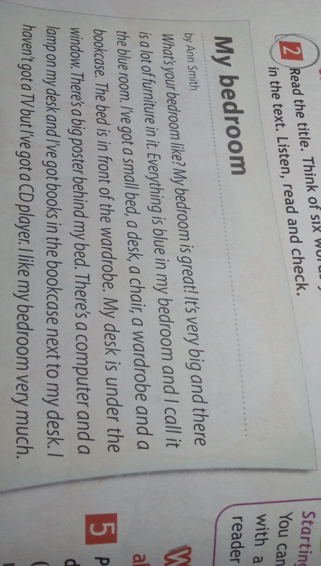 как выглядит моя комната? моя спальня-замечательная! она большая и в ней стоит много мебели. у меня в комнате все синее и я называю ее Сине Комнатой. у меня есть маленькая кровать, письменный стол, стул, шкаф для одежды и книжный шкаф. книжный шкаф стоит перед гардеробом. письменный стол-под окном. за кроватью висит большой плакат. на столе стоит компьютер и лампа и у меня есть книги в книжном шкафу, который рядом с письменным столом. у меня нет телевизора, зато есть CDплеер. мне очень нравиться моя комната.