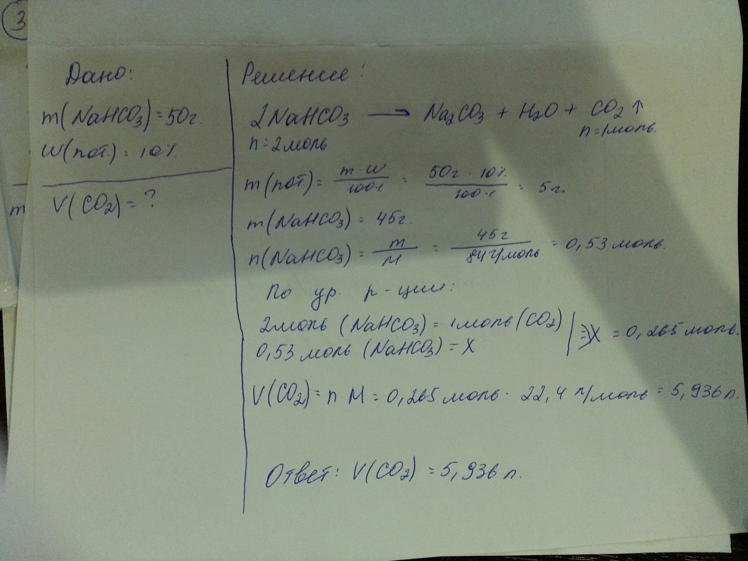 2.Пищевая сода используется как разрыхлитель теста.Какой объём углекислого газа можно получить при прокаливании 50 г пищевой соды, если потери составляют 10 %?
