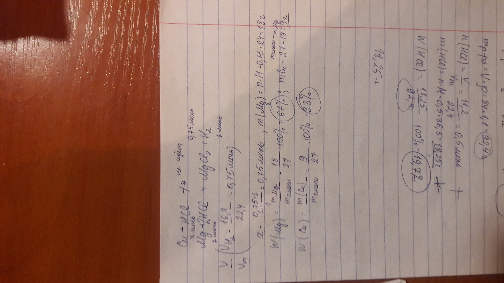 Сплав магния с медью массой 27г растворили в избытке хлоридной кислоты. При этом выделилось 16,8 л водорода (н.у.). Определите массовые доли металлов в сплаве.