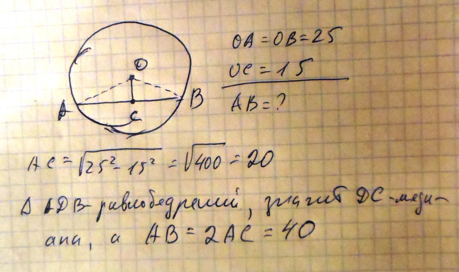 От центра окружности к концам хорды проведем радиусы. Получим равнобедренный треугольник ,так как его боковые стороны равны как радиусы, от сюда следует, что отрезок соединяющий центр окружности с хордой является высотой и медианой. А раз он является медианой, тоэтот отрезок делит хорду попалам. Отрезок соединяющий центр окружности с хордой делит полученный треугольник на два прямоугольных треугольника. По теореме Пифагора найдем половину хорды и она равна корень квадратный из 625-225=корень квадратный из 400=20. Половина хорды равна 20, а значит вся хорда равна 40.