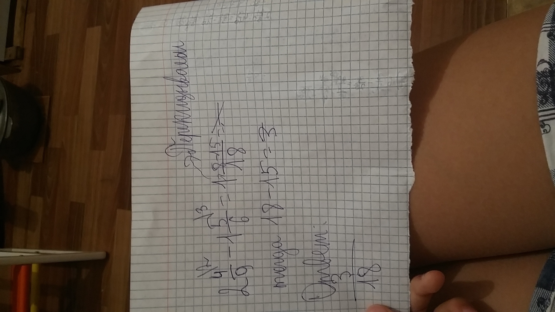 и 18-15=3 знаменатель 18 ЗНАМЕНАТЕЛЬ ВСЕГДА ОСТАЁТСЯ !!!!!ОТВЕТ 3/18