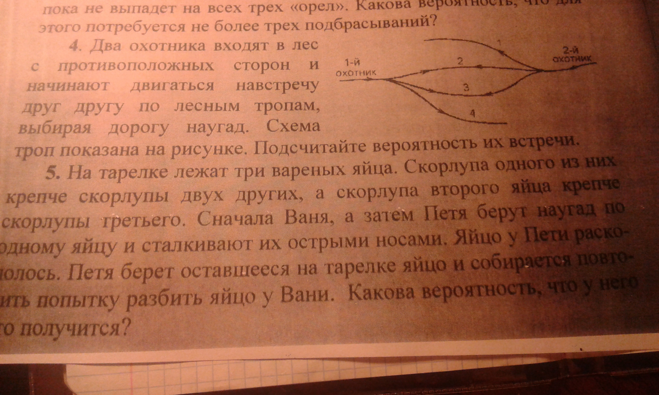 4) Каждый может пойти по одной дорожке, а дорожек всего 3. т.е вероятность пойти по той или иной дорожке равна 1/3 у второго охотника также 1/3, получается, что вероятность их встречи по одной дорожке равна 1/9. У нас по условию сказано, что они могут встретиться по 2-м дорожкам, значит вероятность их встречи равна 2/9.