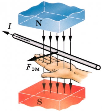 если расположить левую руку так, чтобы линии индукции входили в ладонь, а вытянутые пальцы были направлены вдоль тока, то отведенный большой палец укажет направление силы, действующей на проводник