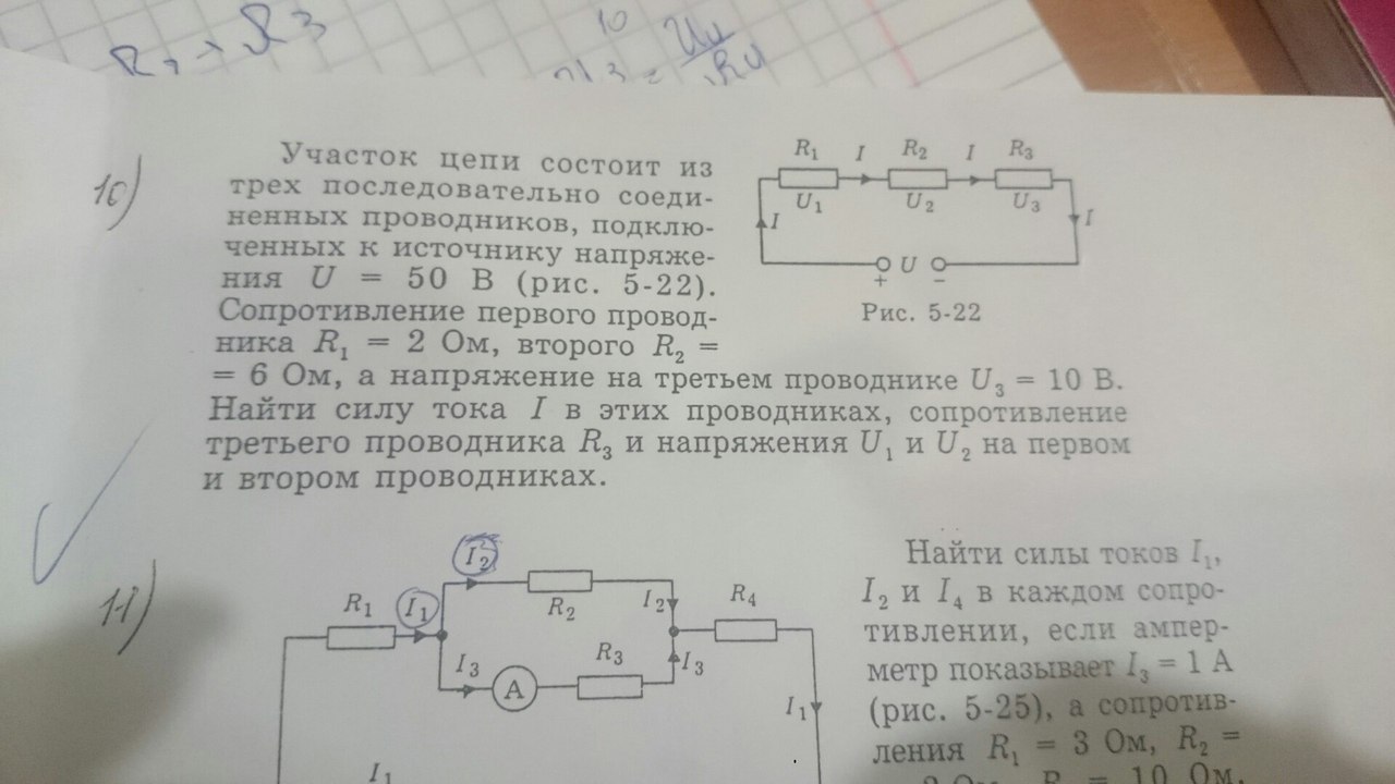 участок цепи состоит из трех последовательно соединенных проводников подключенных к источнику напряжения 50 в рис 5-22 сопротивление 1 проводника 2 ом, второго 6 ом, а напряжение на третьем проводнике 10 в, найти силу тока в этих проводниках, сопротивление 3 проводника, напряжение на 1 и 2 проводнике