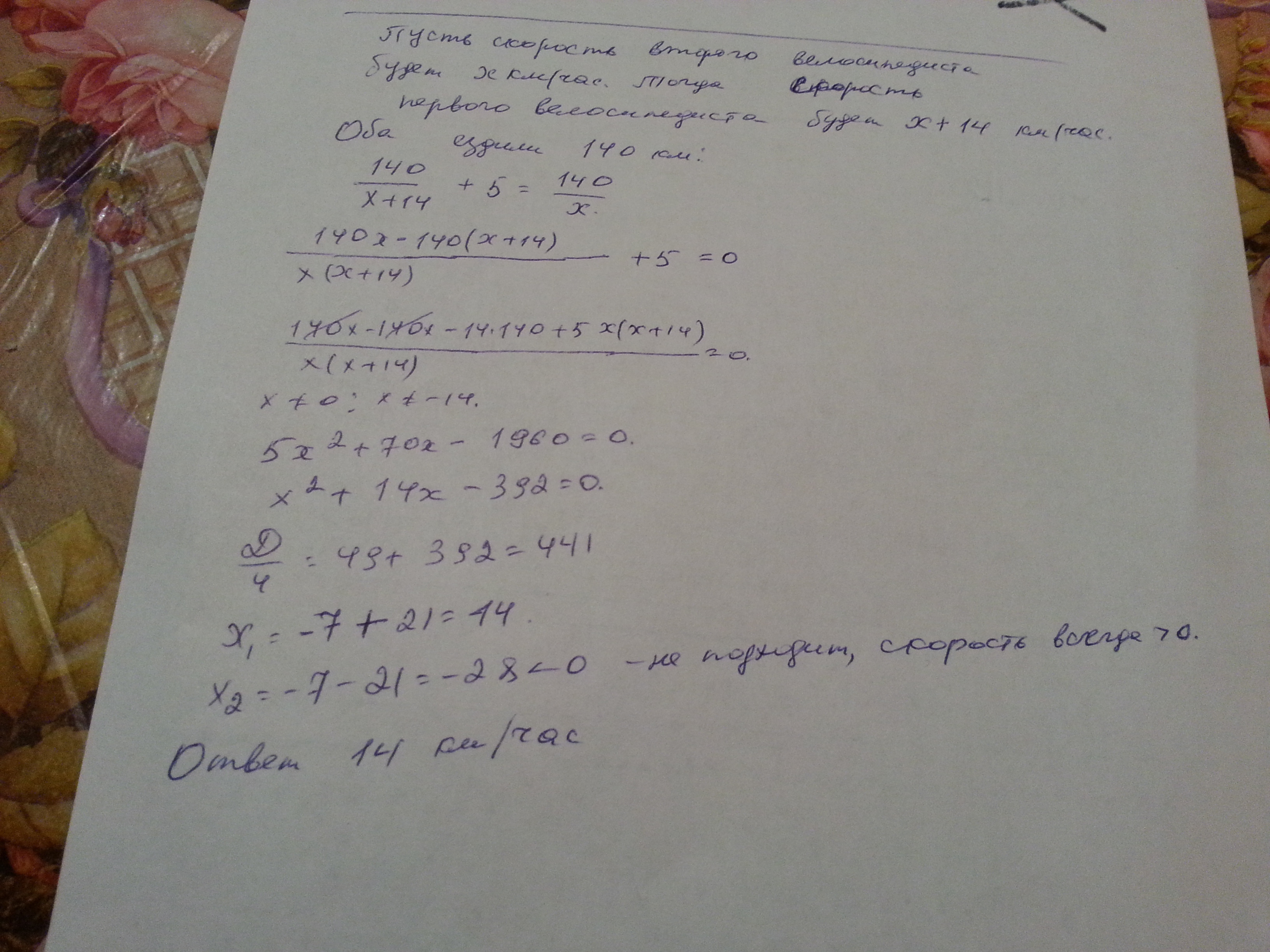 два велосипедиста одновременно отправляются в 140-километровый пробег. Первый едет со скоростью на 14 км/ч большей, чем второй, и прибывает к финишу на 5 часов раньше второго. Найдите скорость велосипедиста, пришедшего к финишу вторым