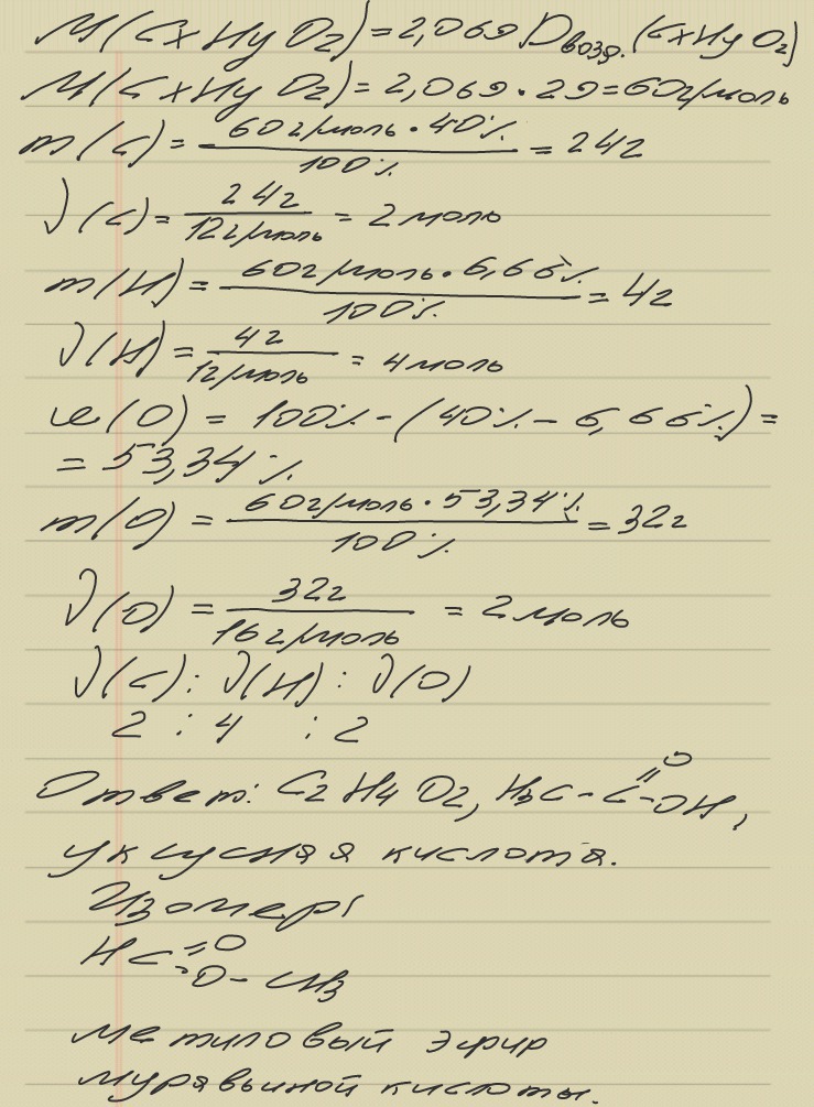 Вещество содержит 40% углерода,6,66% водорода и остальное - кислород.Плотность паров его по воздуху =2,069.Определить его формулу и составить возможные изомеры.