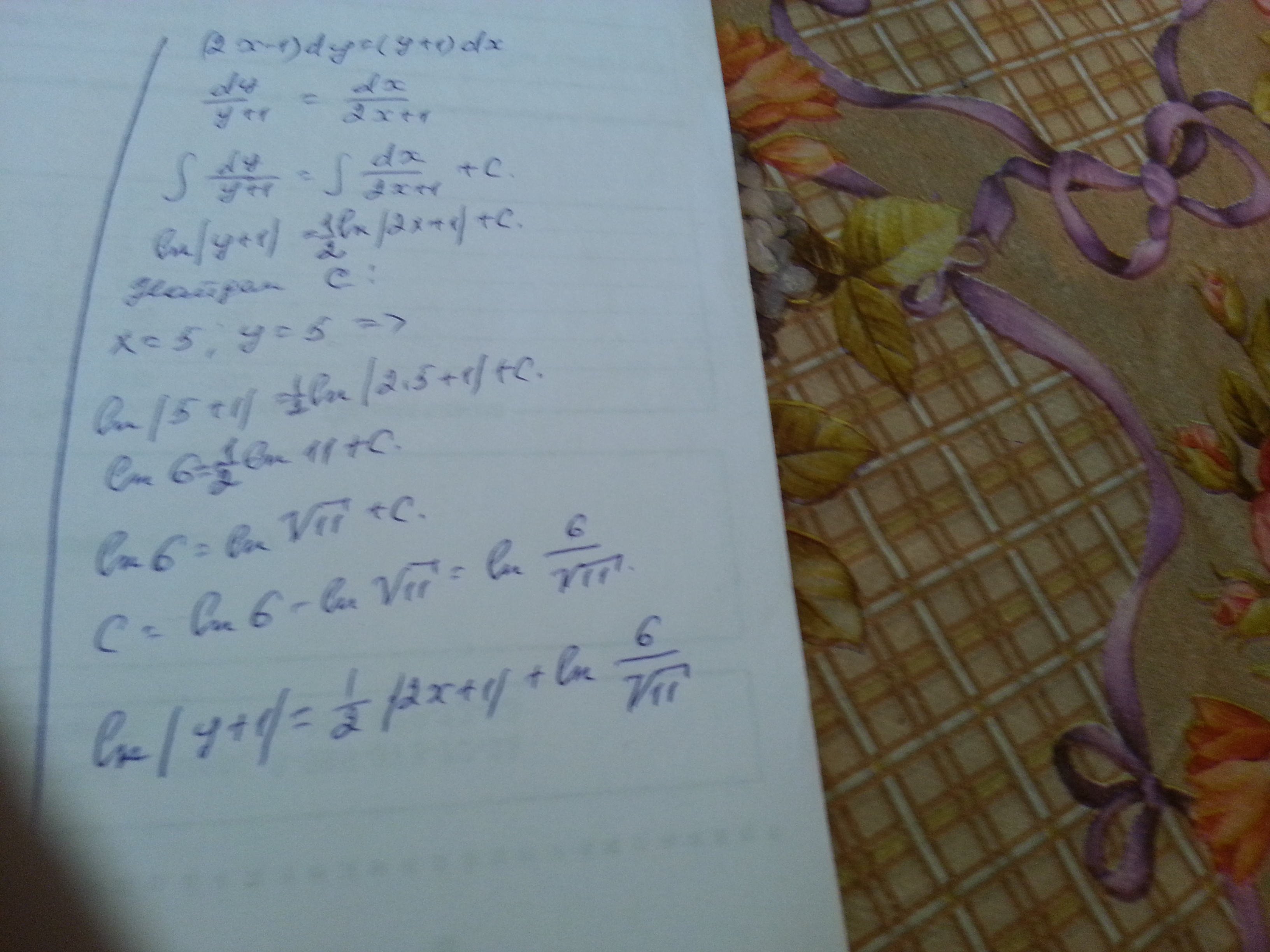 решить дифференциальное уравнение (2х-1) dy=(y+1) dx и найти его частное решение, удовлетворяющее условиям: при х=5 у=5