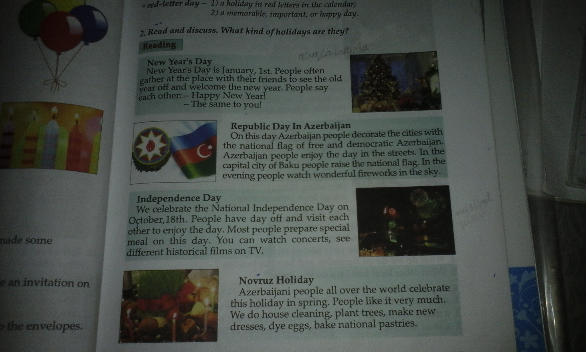3.Мы празднуем Национальный День Независимости18-го октября. Люди в это день и ходят в гости, чтобы насладиться день. Большинство людей готовят специальные блюда в этот день. Вы можете смотреть концерты, увидетьразные исторические фильмы на ТВ.4.Праздник Новруз.Азербайджанский народ во всем мире отмечаютэтот праздник весной. Таких людей очень много.Мы делаем дома уборку, садим деревья, шьем новыйплатья, красим яйца, выпекаем национальную выпечку.