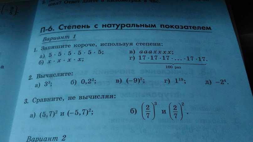 В первом номере тебе необходимо записать число в степени( степень считается количеством этих чисел). Например, 5×5×5×5×5×5, здесь 6 пятерок, значит 5 будет в 6 степени. Дальше 4 икса, значит икс в 4 степени и т.д.