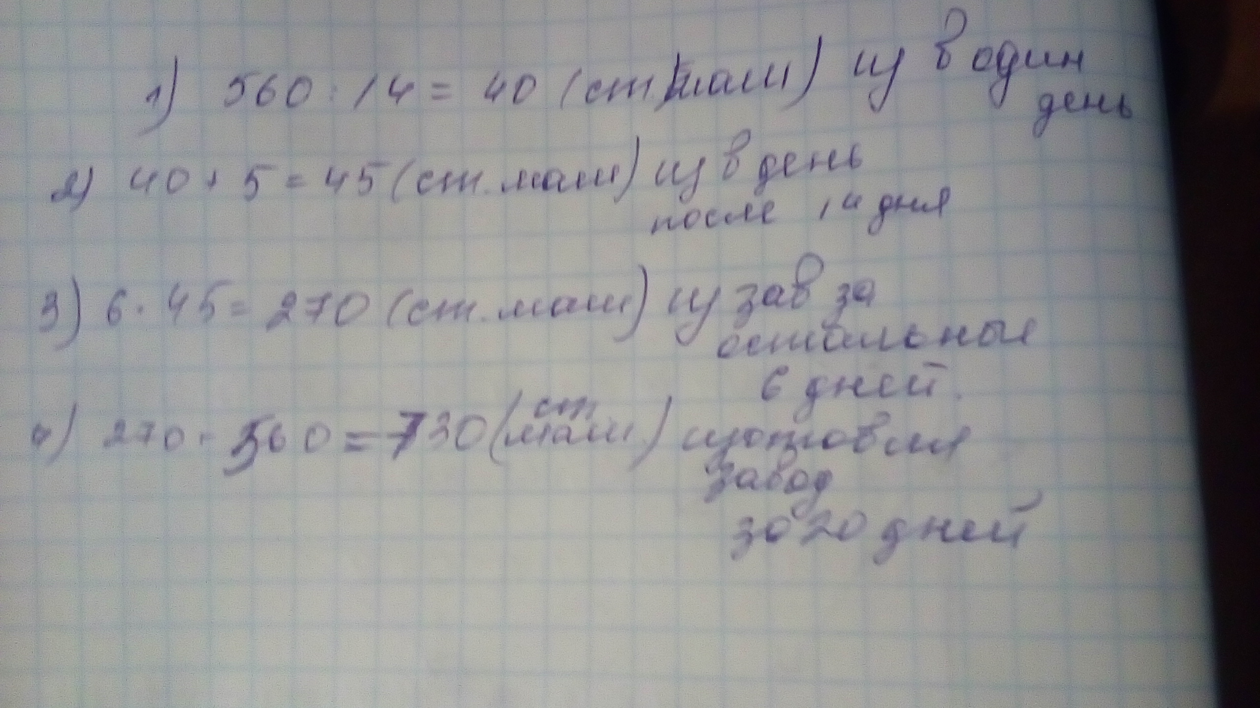 решение задачи: за первые 14 рабочих дней квартала завод изготовил 560 одинаковых стир. машин ,а затем стал изготовлять в день на 5 машин больше. сколько машин выпустил завод за 20 дней? как решить