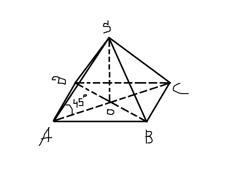 равна 2 корня из2 ее боковое ребро наклонено к плоскости под углом 45 вычислите площадь диагонального сечения пирамиды