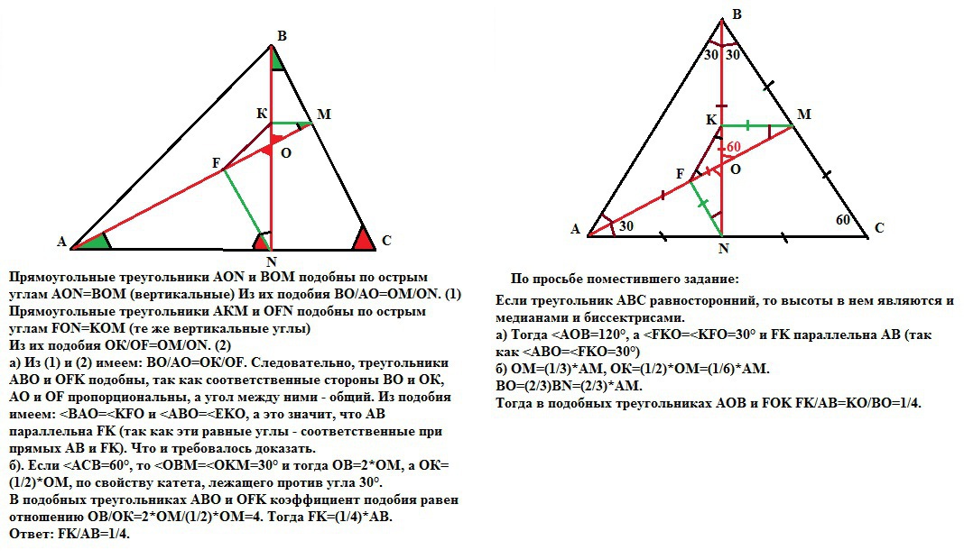 Прямоугольные треугольники АКМ и OFN подобны по острым углам FОN=KОМ (те же вертикальные углы).