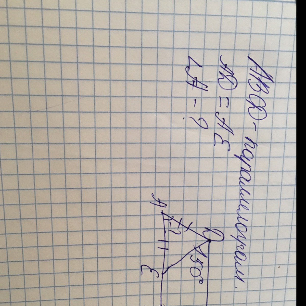 угол А =(360-150):2=105