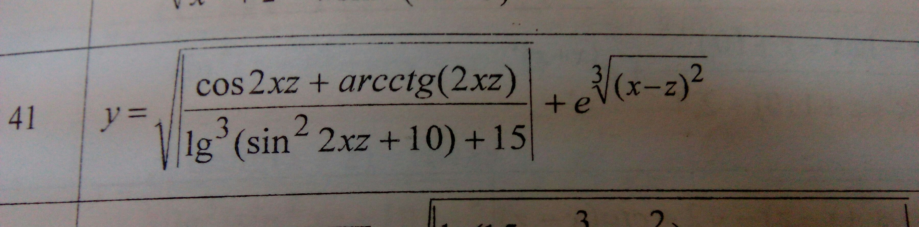 Sqrt(Abs((Cos(2*x*z)+ArcTan(2*x*z))/(Exp(3*Ln(10)))*(((1-Cos(2*2*x*z))/2)+10)+15))+Exp(Exp(1/3*ln(Sqrt(Sqr(x-z))))*Ln(e)