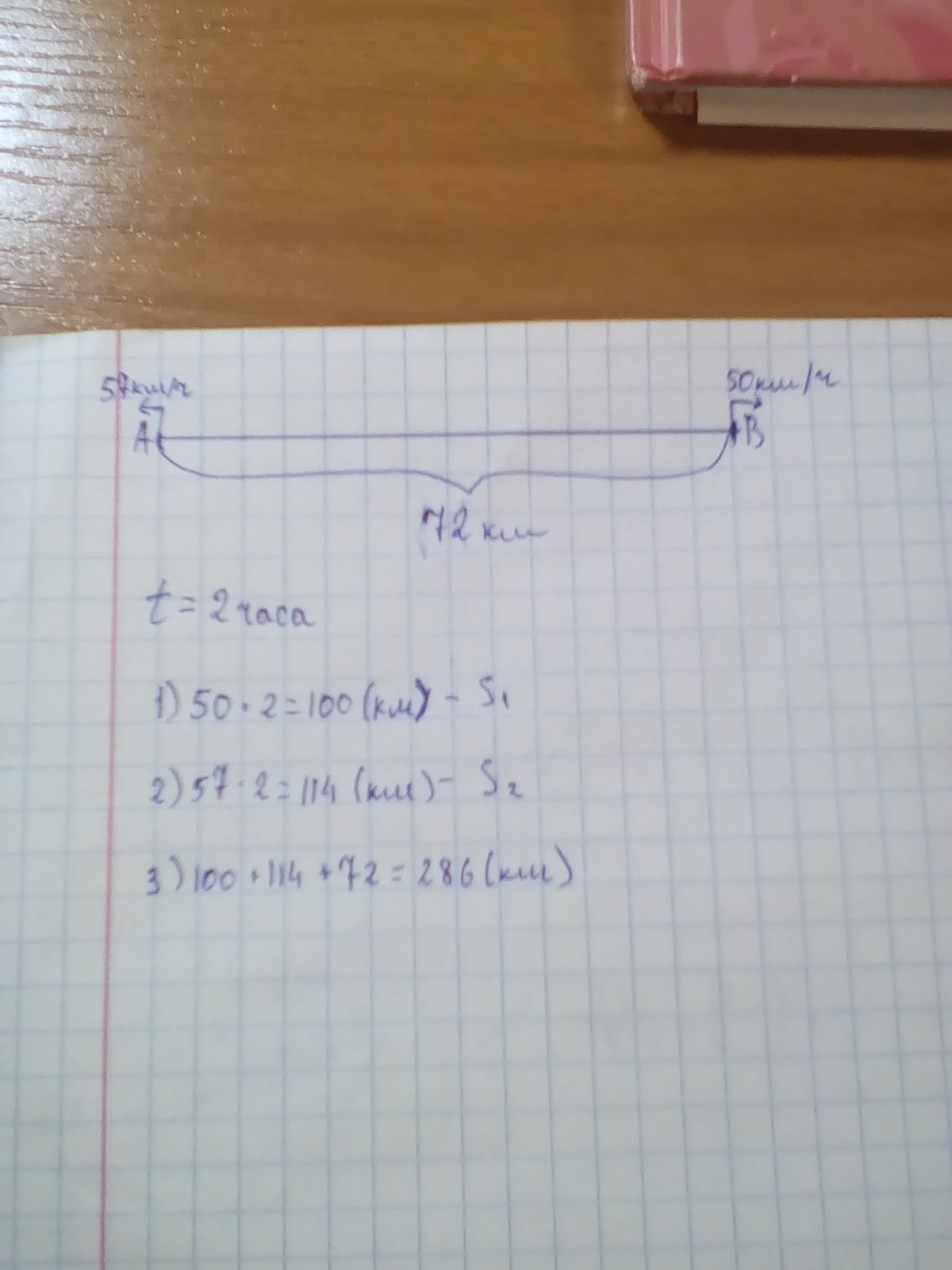 расстояние между городами A и B 72 из таких городов одинаково одинаковое время в противоположных направлениях выехали два автобуса Скорость одного автобуса 50 км в час скорость второго 57 км в час На каком расстоянии друг от друга Они будут через 2 часа.помогите пожалуйста