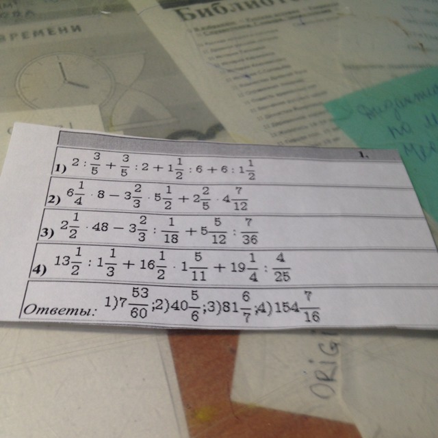 1)2/1*5/3+3/5*1/2+3/2*1/6+6/1*2/3= 2/1*5/3+3/5*1/2+1/2*1/2+2/1*2/1 = 10/3+3/10+1/4+4= 200/60+18/60+15/60+240/60=473/60=7 53/60