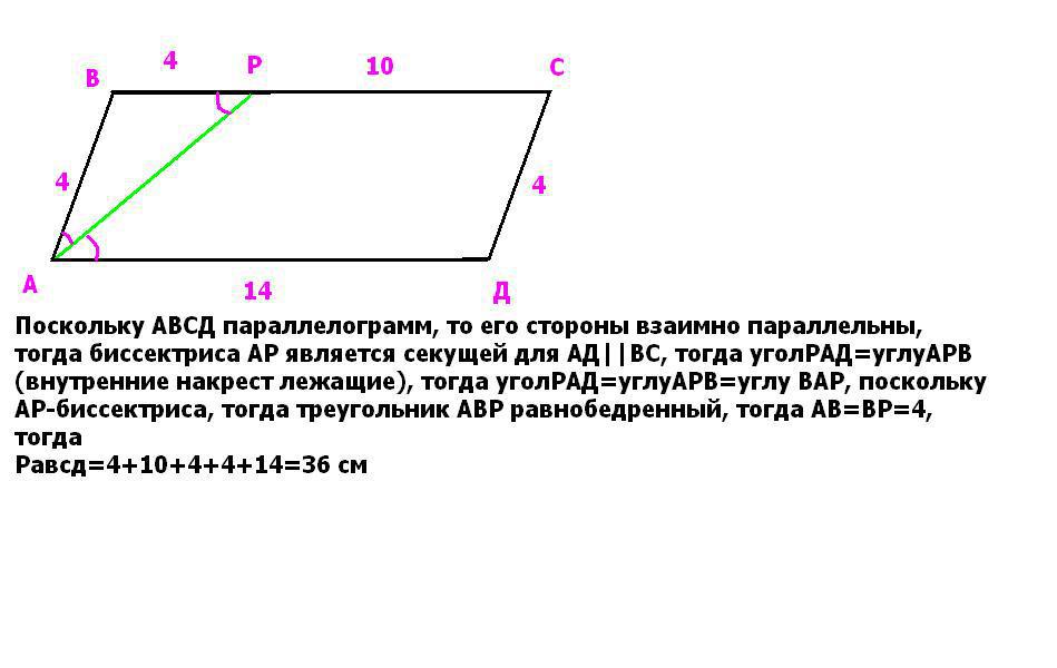 диаметром угла А параллелограма пересекает сторону ВС в точке Р ,ВР=4см,РС=10см . Вычислите периметр а параллелограма